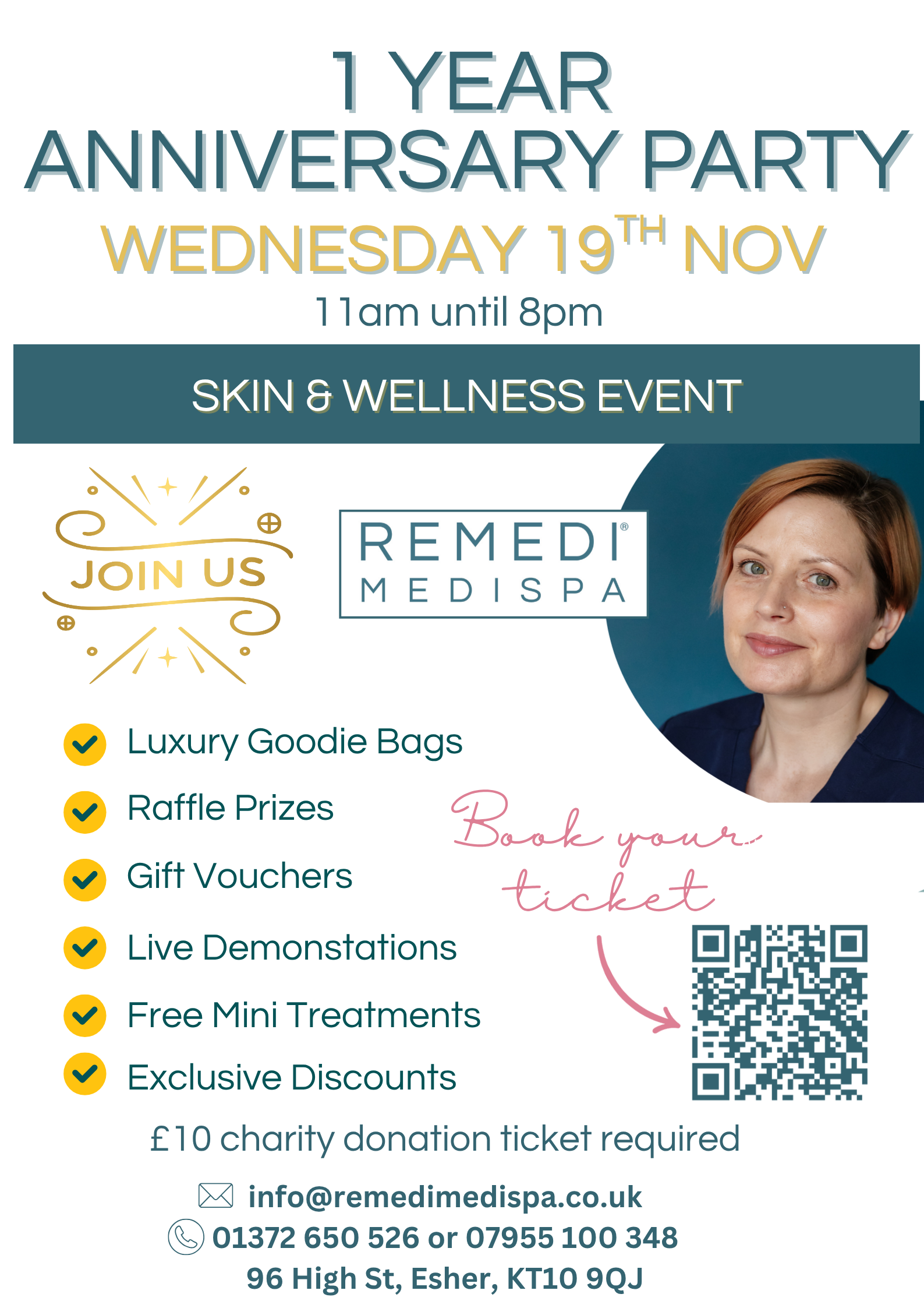 Join us on Wednesday 19th November from 11am to 8pm at Remedi Medispa, Esher as we celebrate one incredible year of helping you feel and look your best!